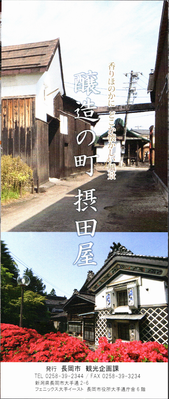 歴史の町 摂田屋 長岡の市街地は、太平洋戦争でそのほとんどを 焼失しましたが、摂田屋は危うく難を逃れました。 おかげで、醸造関係を中心に明治・大正の建物 が残り、とこか懐かしさの感じられる景観があります。 古くから街道や信濃川の川湊として開けていたと 伝えられており、摂田屋という地名は中世の武士 や僧侶の簡易宿泊所「接待屋」に由来するという 説が有力です。 江戸時代には上野寛永寺の領地に組み込まれ、 ゆるい規制と恵まれた立地条件のもと、 味噌・醤油・酒の蔵元が集積しました。 現在でも6つの蔵元が残り製造を続けています。 麹や醤油の香りが漂うこの町を楽しむには散策が 一番です。歴史のあたたかさを感じながら、 ゆったりと摂田屋を満喫してください。 歴史の町 摂田屋 パンフレット序文より